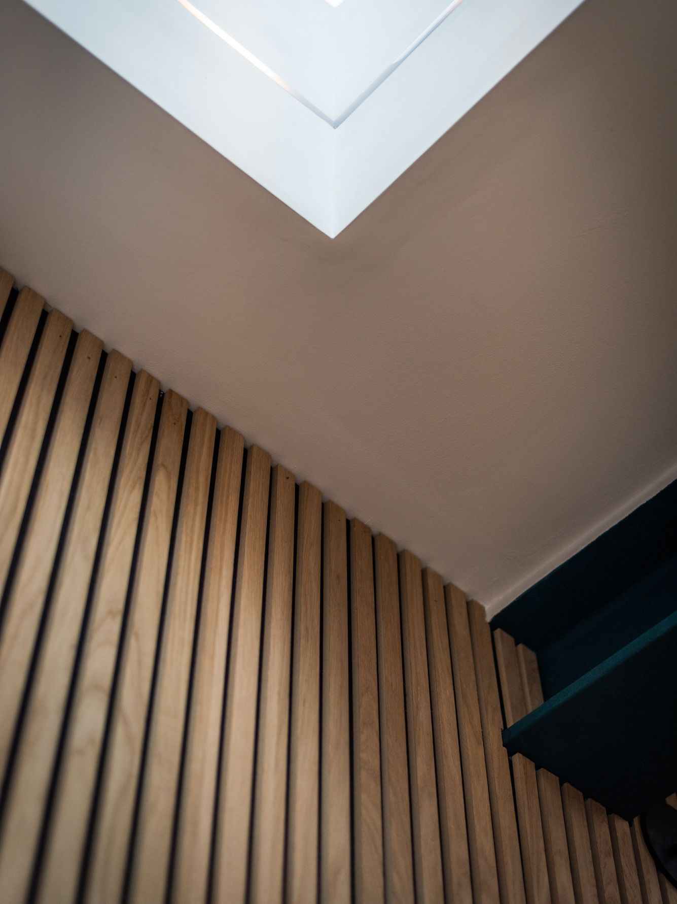 The exposed structure extends to hidden columns forming the stability frame. Not only does this design provide support to the stepping rear façade, first floor and roof, but also replicates the stability provided by the masonry façade which was demolished to create the open space. The steelwork extends beyond the perimeter of the extension to form the cantilevered canopy.